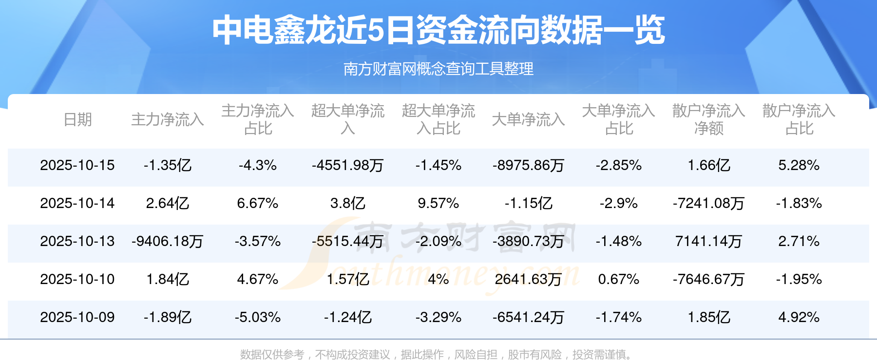 10月15日消息,中电鑫龙主力资金净流出1.35亿元,超大单资金净流出4551.98万元,散户资金净流入1.66亿元。
