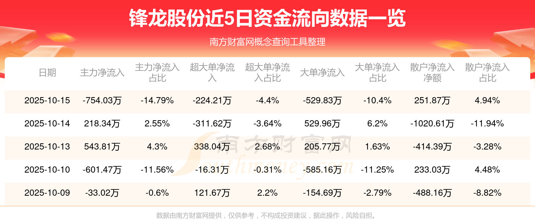 10月15日消息,锋龙股份资金净流出754.03万元,超大单资金净流出224.21万元,换手率1.66%,成交金额5096.8万元。