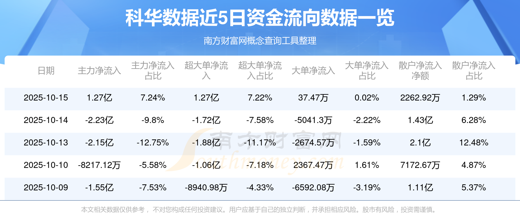 10月15日消息,科华数据10月15日主力资金净流入1.27亿元,超大单资金净流入1.27亿元,大单资金净流入37.47万元,散户资金净流入2262.92万元。