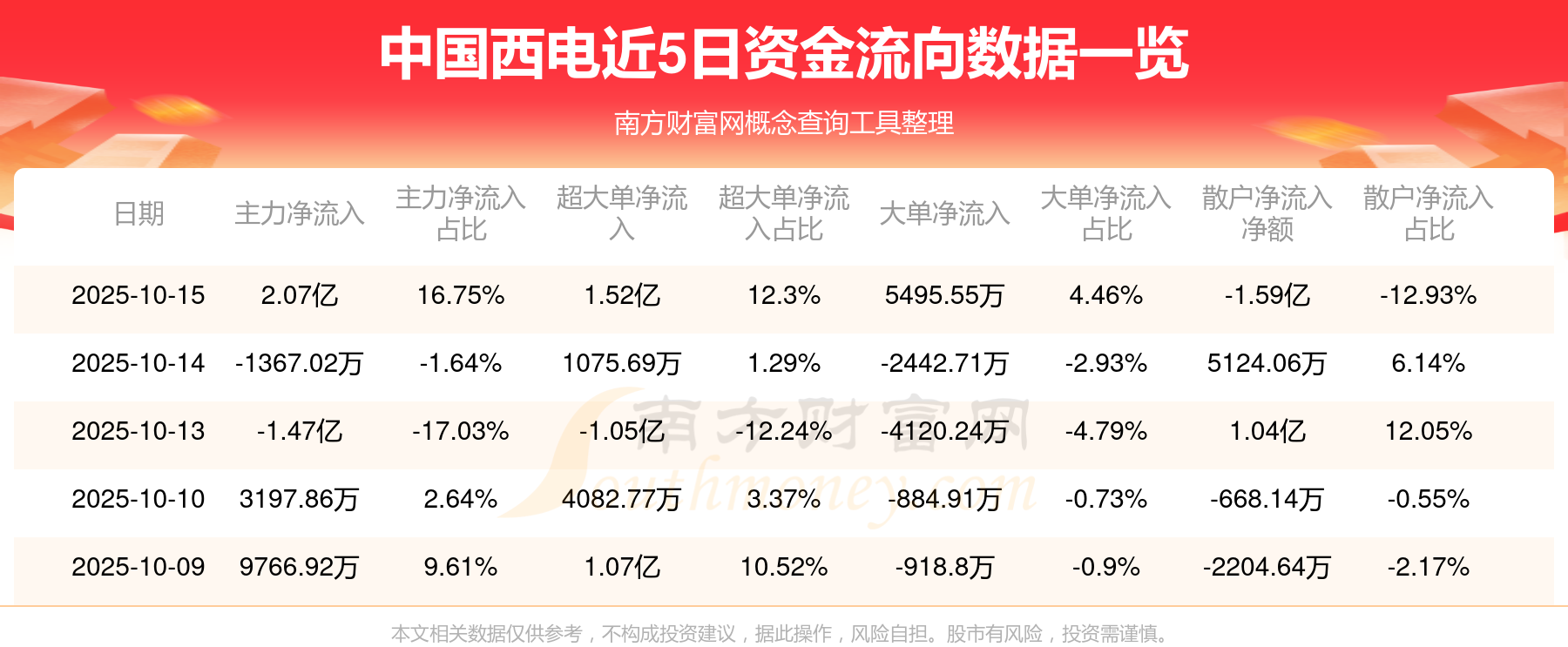 资金流向数据方面,10月15日主力资金净流流入2.07亿元,超大单资金净流入1.52亿元,大单资金净流入5495.55万元,散户资金净流出1.59亿元。