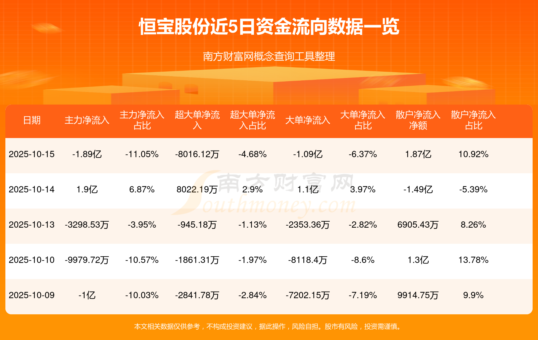 10月15日消息,恒宝股份10月15日主力资金净流出1.89亿元,超大单资金净流出8016.12万元,大单资金净流出1.09亿元,散户资金净流入1.87亿元。