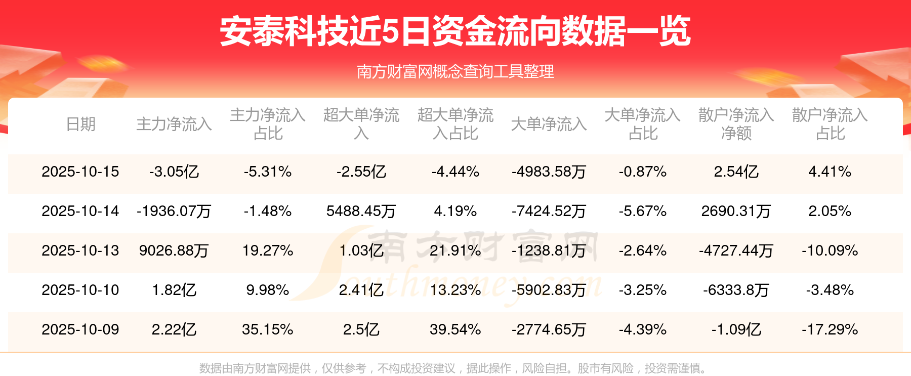 10月15日消息,安泰科技10月15日主力净流出3.05亿元,超大单净流出2.55亿元,大单净流出4983.58万元,散户净流入2.54亿元。