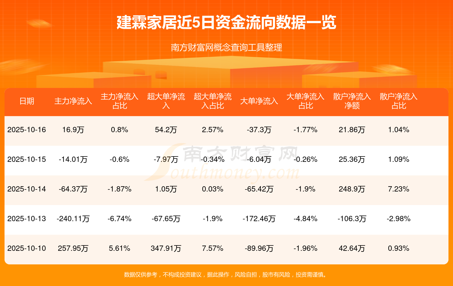 10月16日消息,建霖家居10月16日主力净流入16.9万元,超大单净流入54.2万元,大单净流出37.3万元,散户净流入21.86万元。