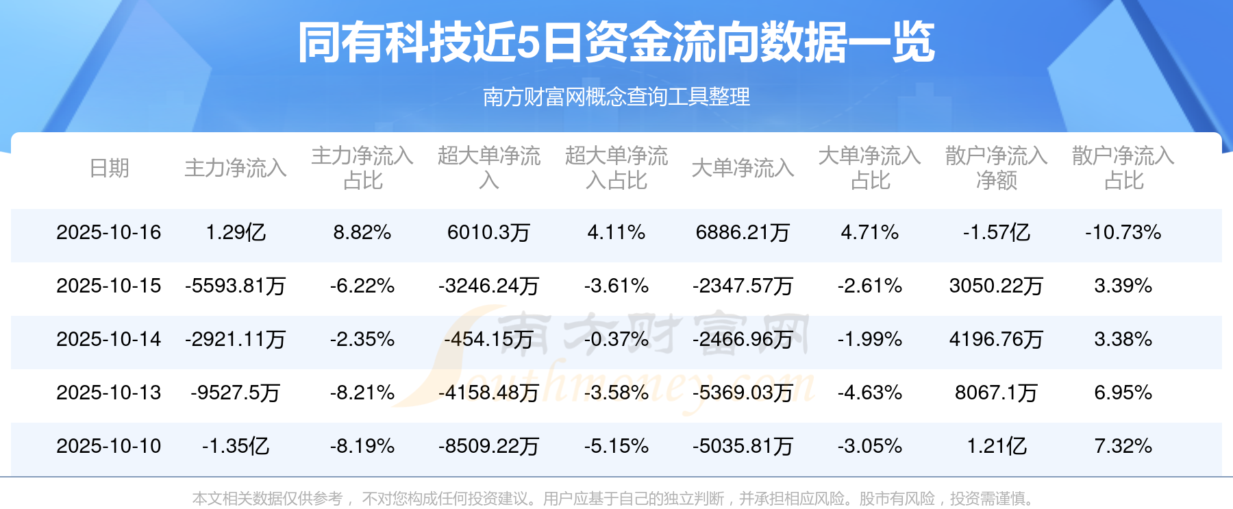 10月16日消息,同有科技10月16日主力净流入1.29亿元,超大单净流入6010.3万元,大单净流入6886.21万元,散户净流出1.57亿元。