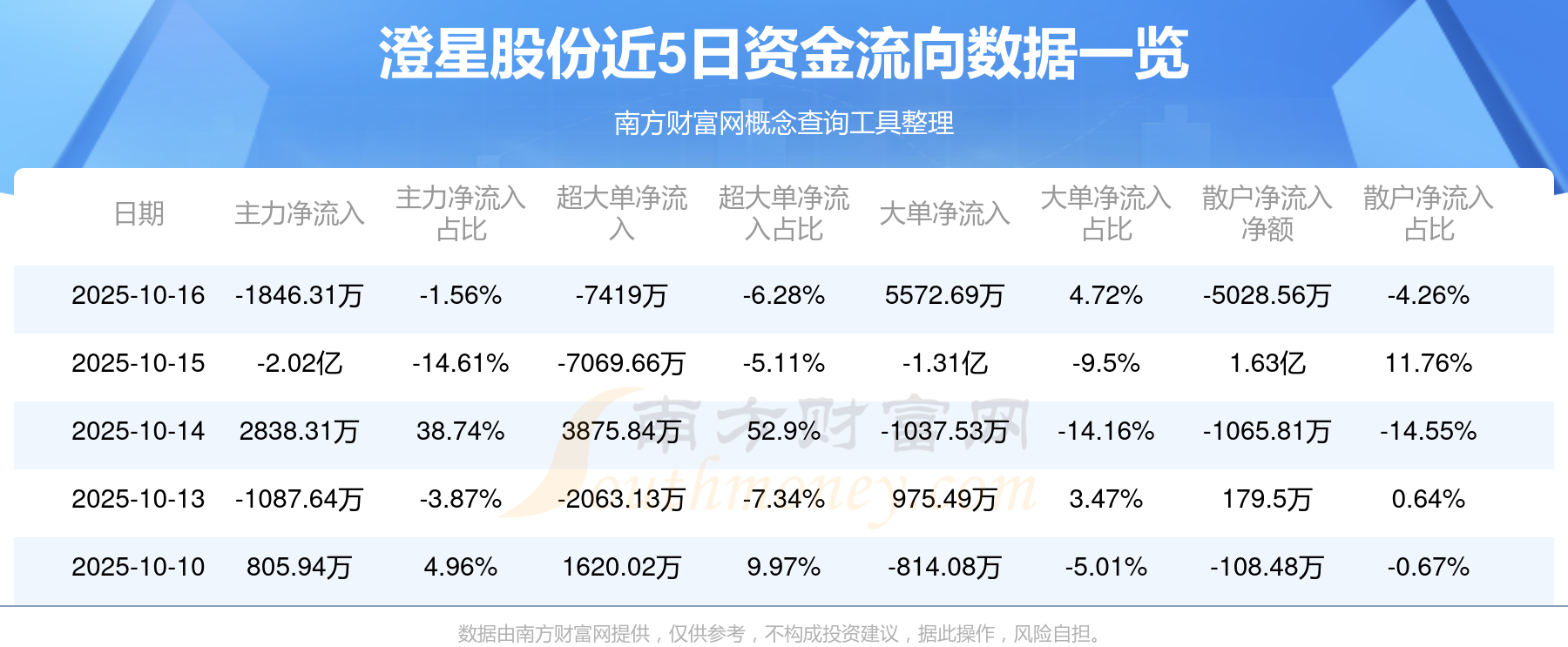 10月16日消息,澄星股份主力资金净流出1846.31万元,超大单资金净流出7419万元,散户资金净流出5028.56万元。