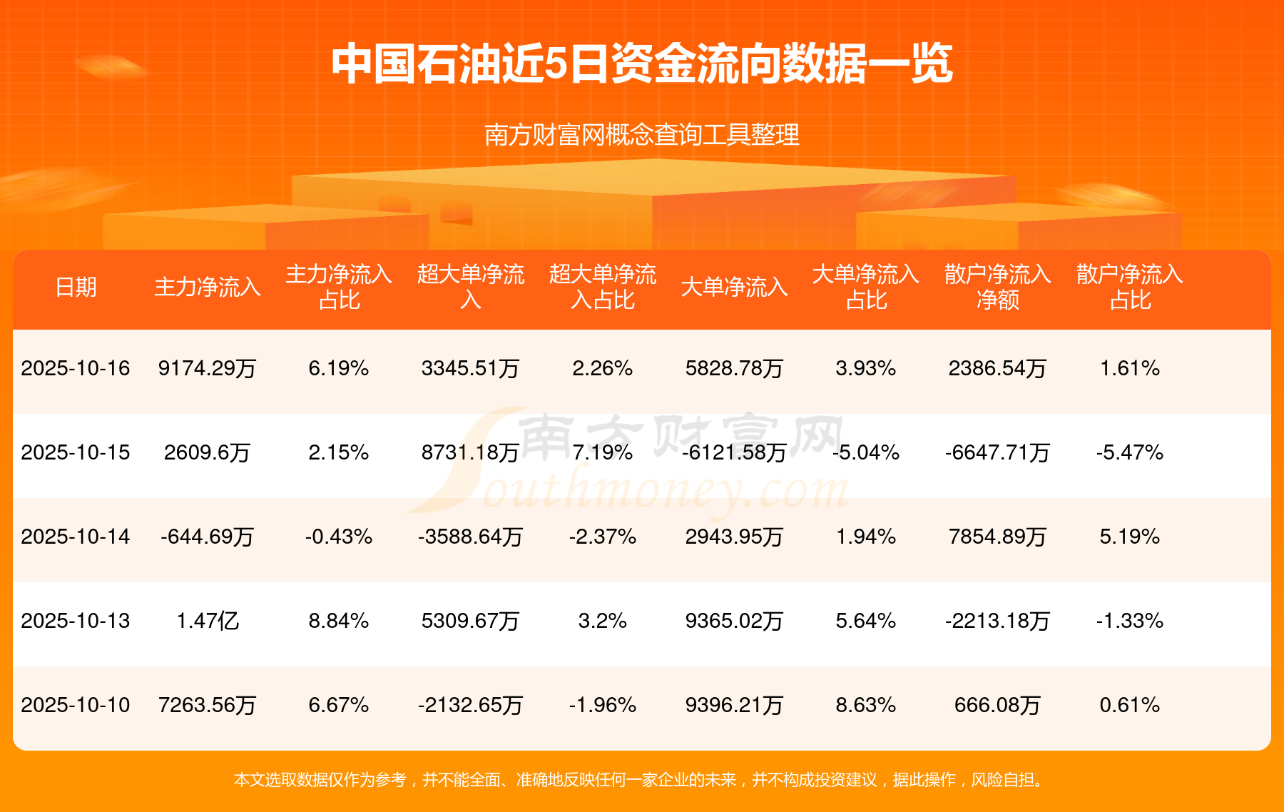 10月16日消息,中国石油10月16日主力净流入9174.29万元,超大单净流入3345.51万元,大单净流入5828.78万元,散户净流入2386.54万元。