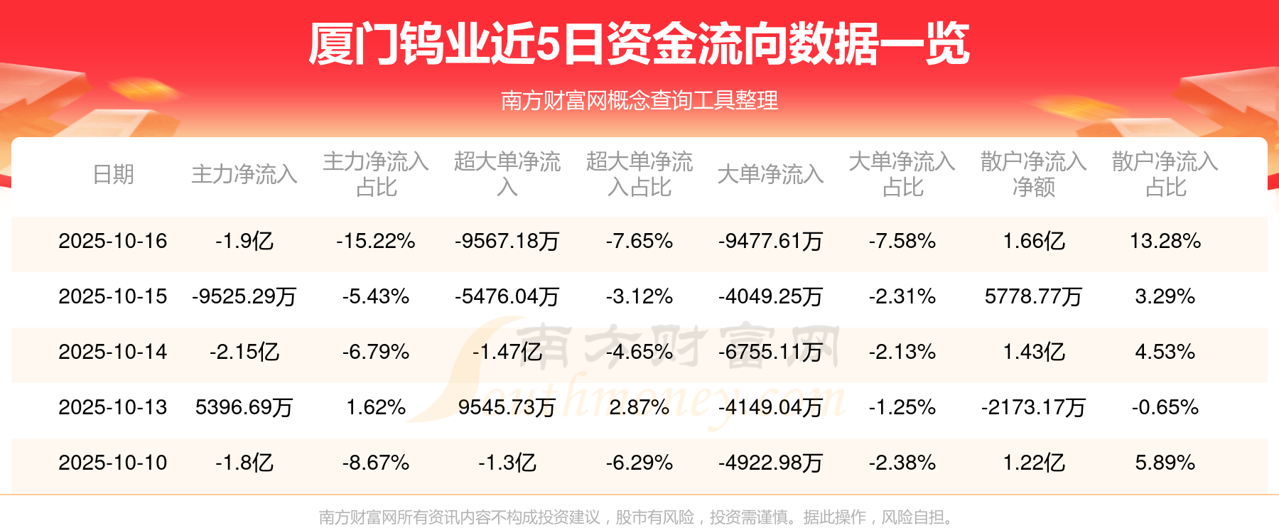 10月16日消息,厦门钨业主力净流出1.9亿元,超大单净流出9567.18万元,散户净流入1.66亿元。