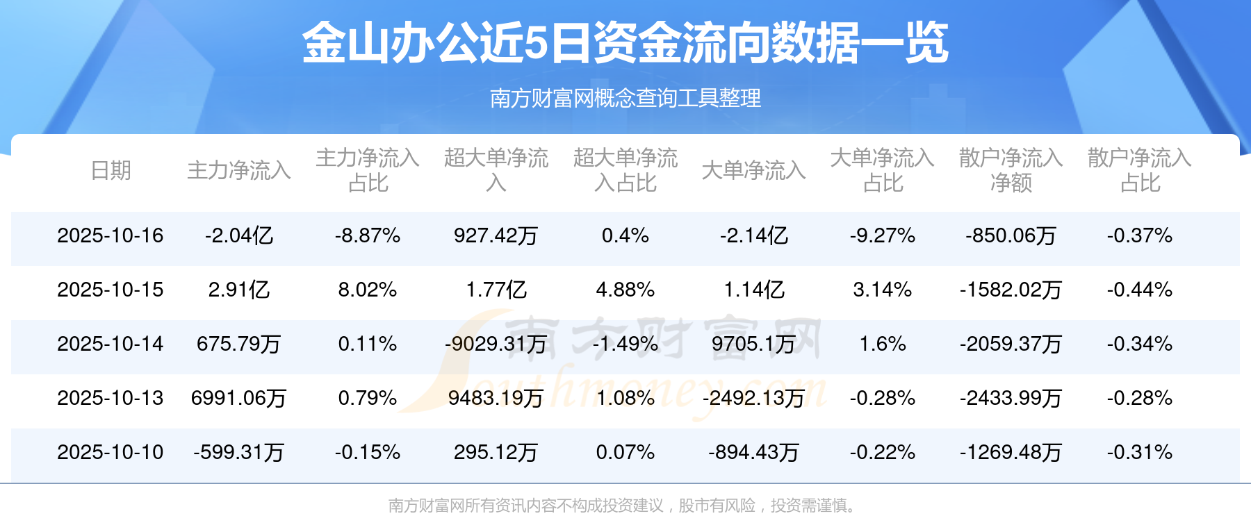10月16日消息,金山办公主力资金净流出2.04亿元,超大单资金净流入927.42万元,散户资金净流出850.06万元。