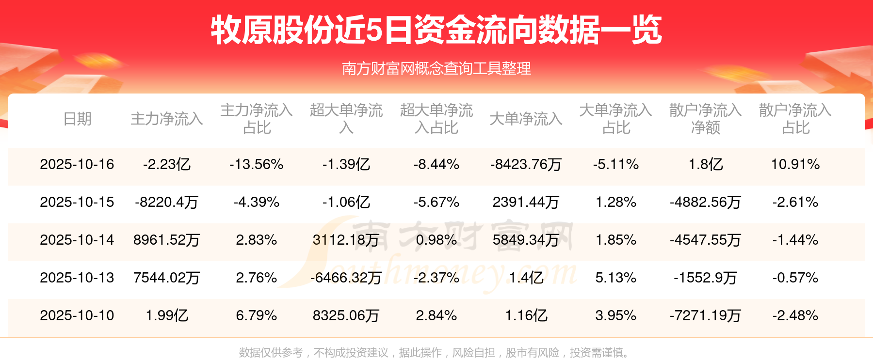 10月16日消息,牧原股份主力资金净流出2.23亿元,超大单资金净流出1.39亿元,散户资金净流入1.8亿元。