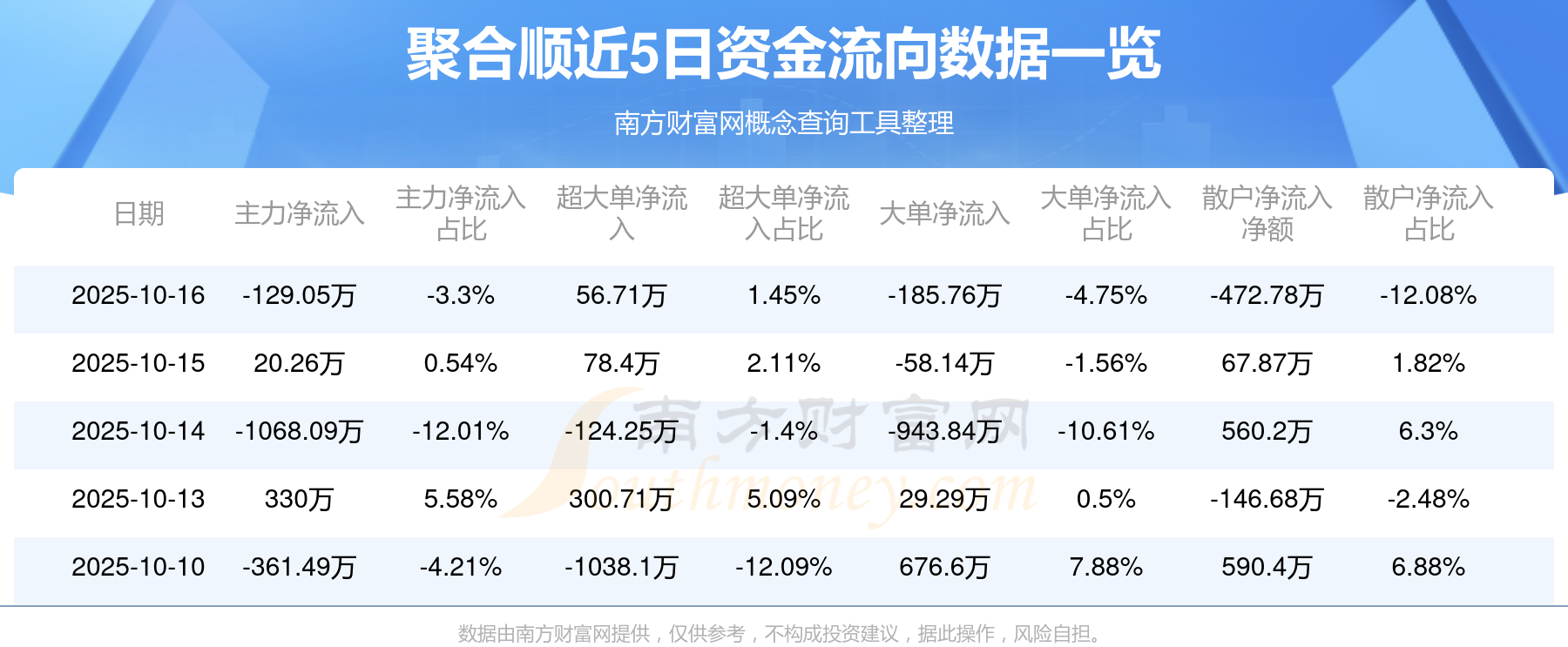 10月16日消息,聚合顺资金净流出129.05万元,超大单资金净流入56.71万元,换手率1.1%,成交金额3913.35万元。