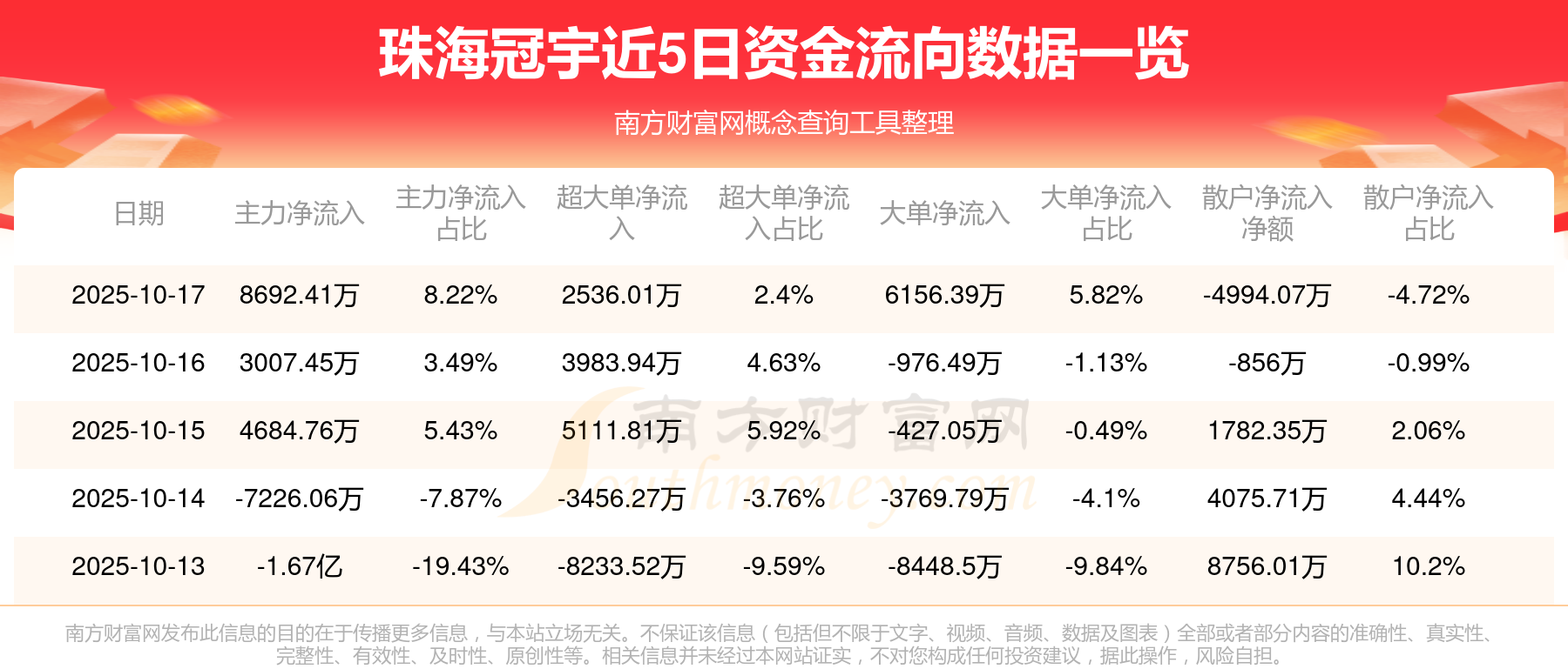 10月17日消息,珠海冠宇主力资金净流入8692.41万元,超大单资金净流入2536.01万元,散户资金净流出4994.07万元。