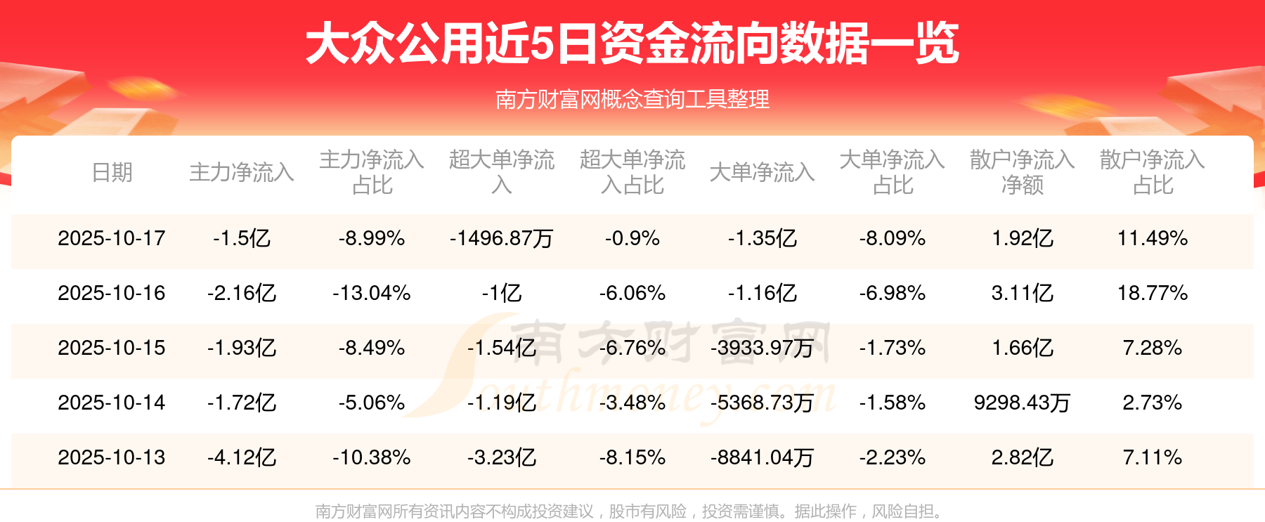 10月17日消息,大众公用主力净流出1.5亿元,超大单净流出1496.87万元,散户净流入1.92亿元。
