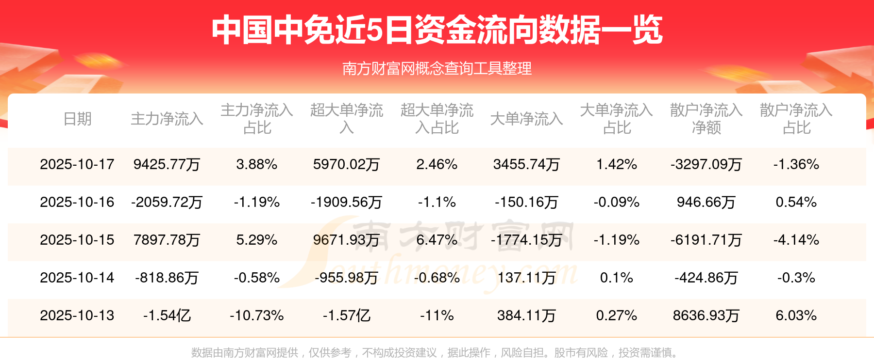 10月17日消息,中国中免10月17日主力净流入9425.77万元,超大单净流入5970.02万元,大单净流入3455.74万元,散户净流出3297.09万元。