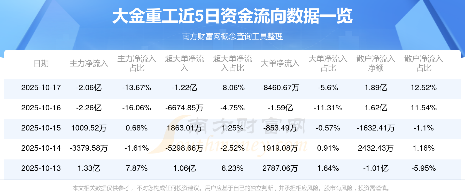10月17日消息,大金重工主力资金净流出2.06亿元,超大单资金净流出1.22亿元,散户资金净流入1.89亿元。