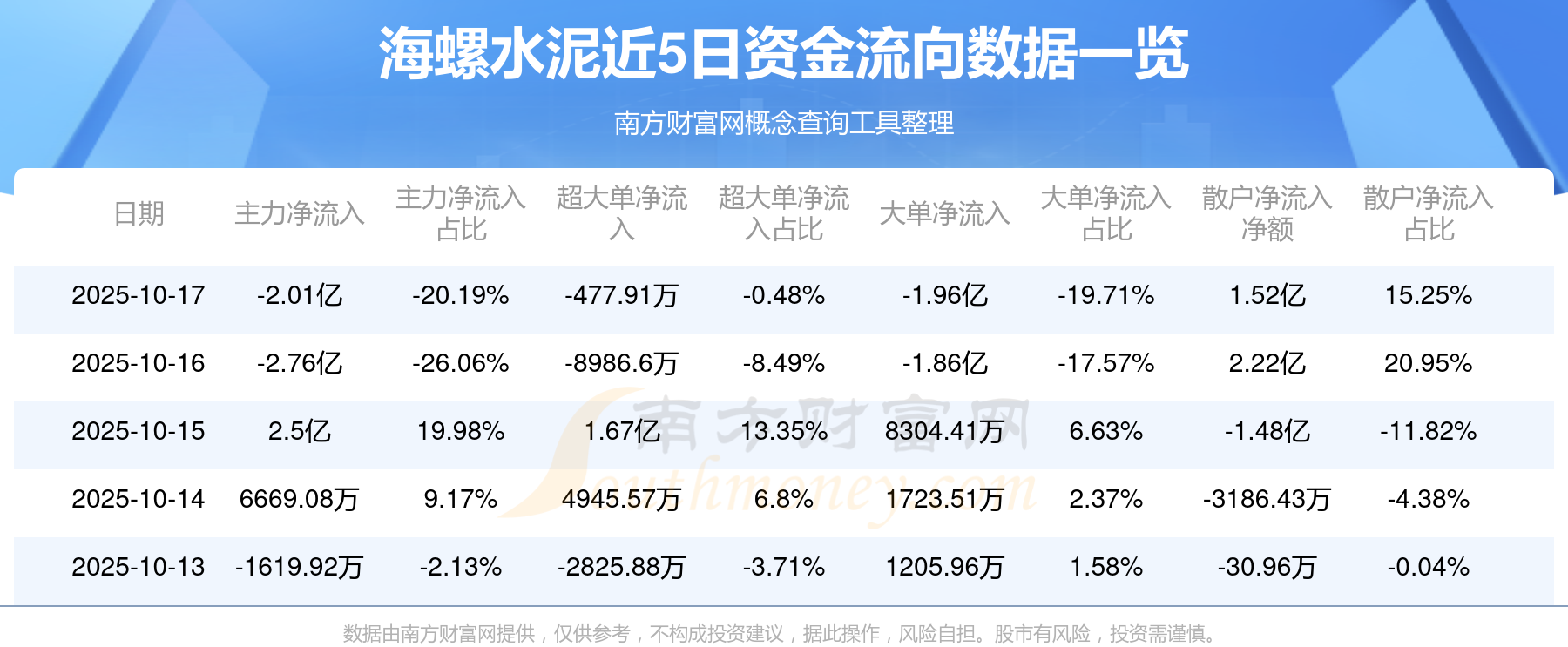 10月17日消息,海螺水泥10月17日主力资金净流出2.01亿元,超大单资金净流出477.91万元,大单资金净流出1.96亿元,散户资金净流入1.52亿元。