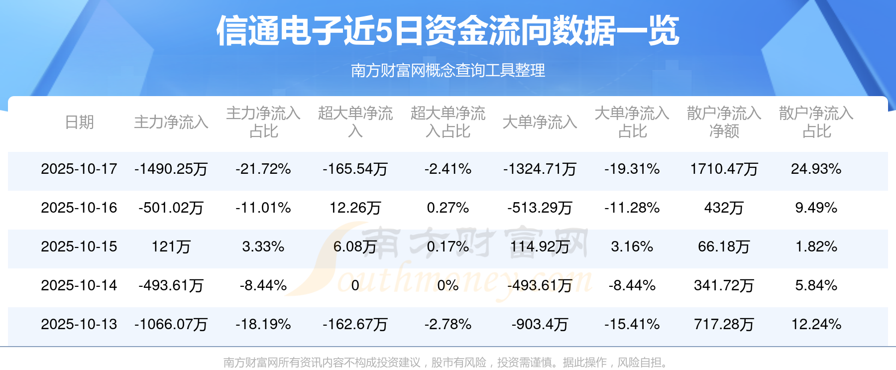 10月17日消息,信通电子10月17日主力资金净流出1490.25万元,超大单资金净流出165.54万元,大单资金净流出1324.71万元,散户资金净流入1710.47万元。