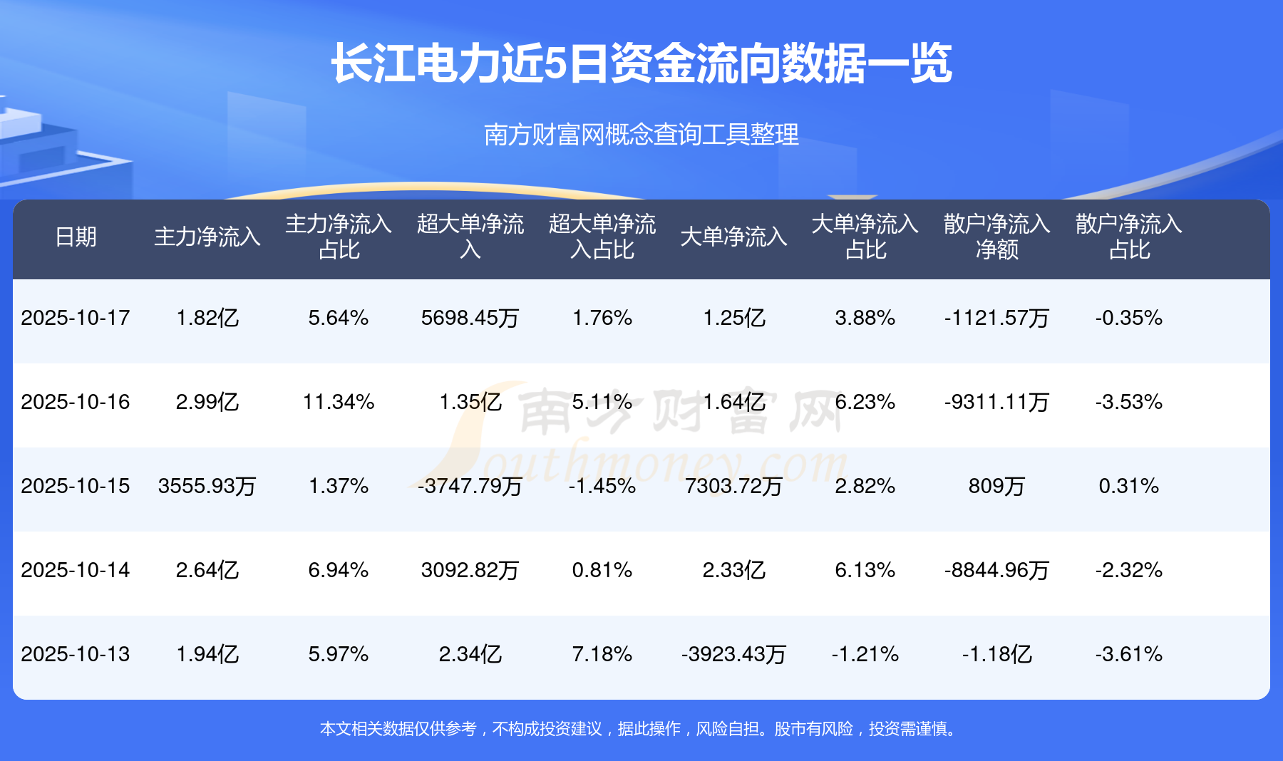 10月17日消息,长江电力主力净流入1.82亿元,超大单净流入5698.45万元,散户净流出1121.57万元。