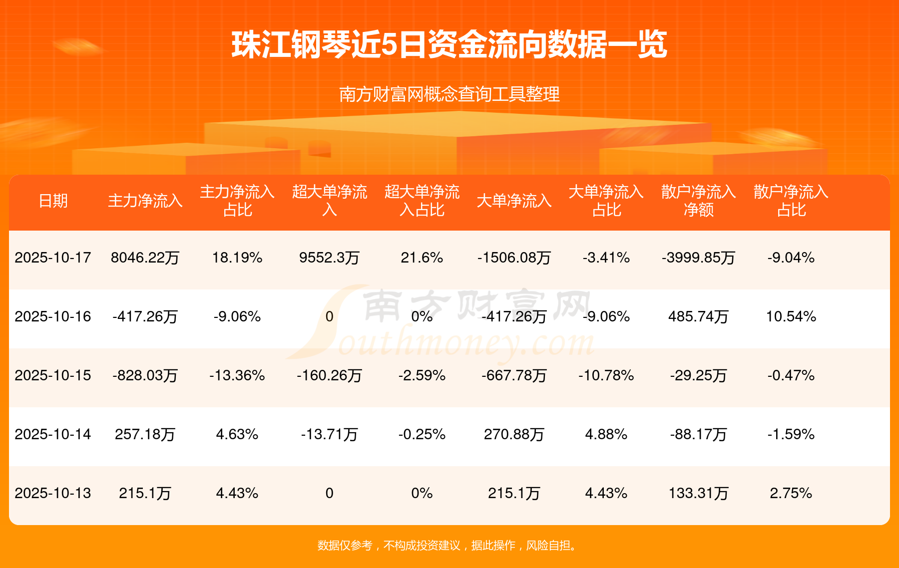 10月17日消息,珠江钢琴10月17日主力净流入8046.22万元,超大单净流入9552.3万元,大单净流出1506.08万元,散户净流出3999.85万元。