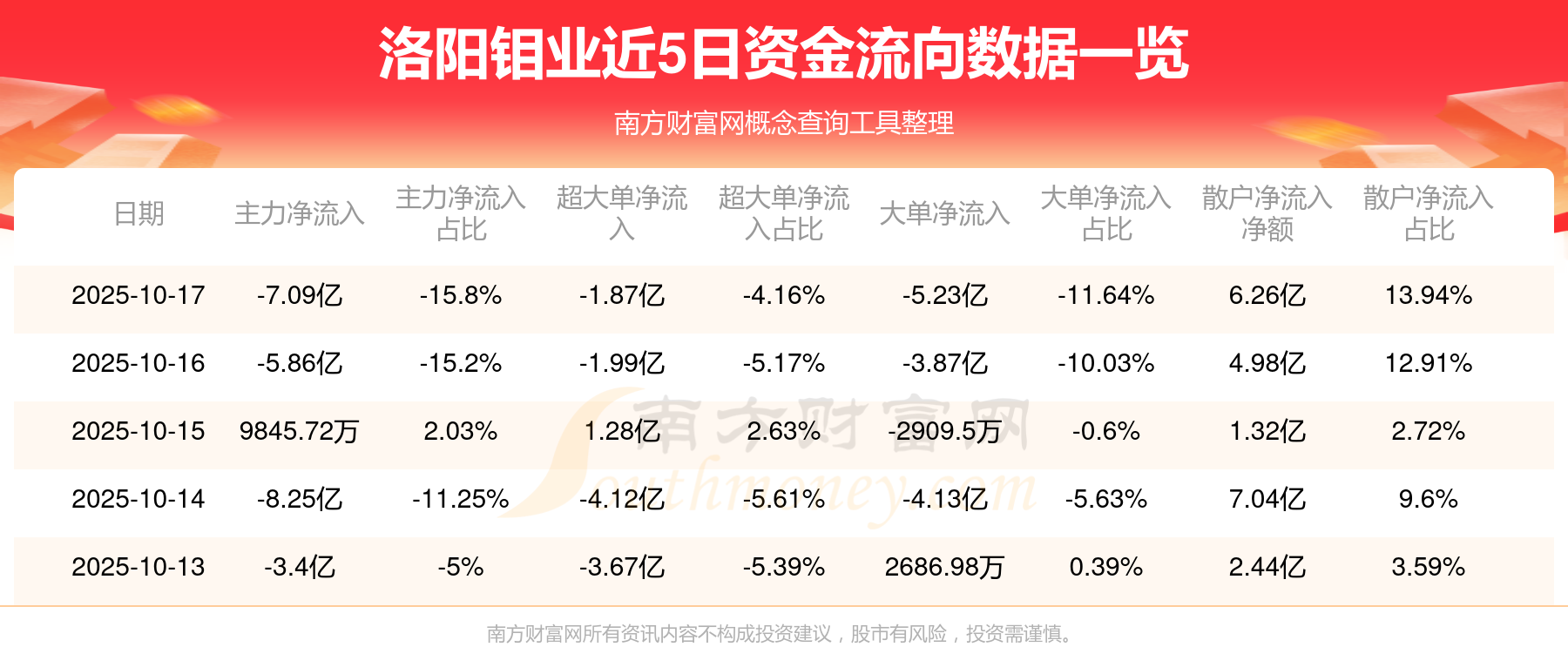 10月17日消息,洛阳钼业10月17日主力净流出7.09亿元,超大单净流出1.87亿元,大单净流出5.23亿元,散户净流入6.26亿元。