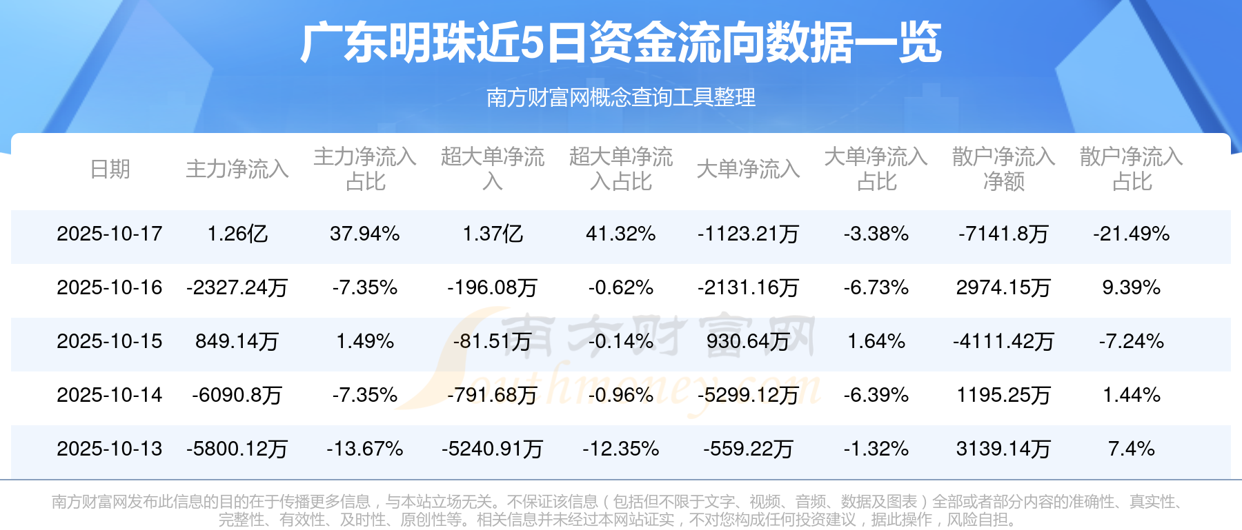10月17日消息,广东明珠资金净流入1.26亿元,超大单资金净流入1.37亿元,换手率6.6%,成交金额3.32亿元。