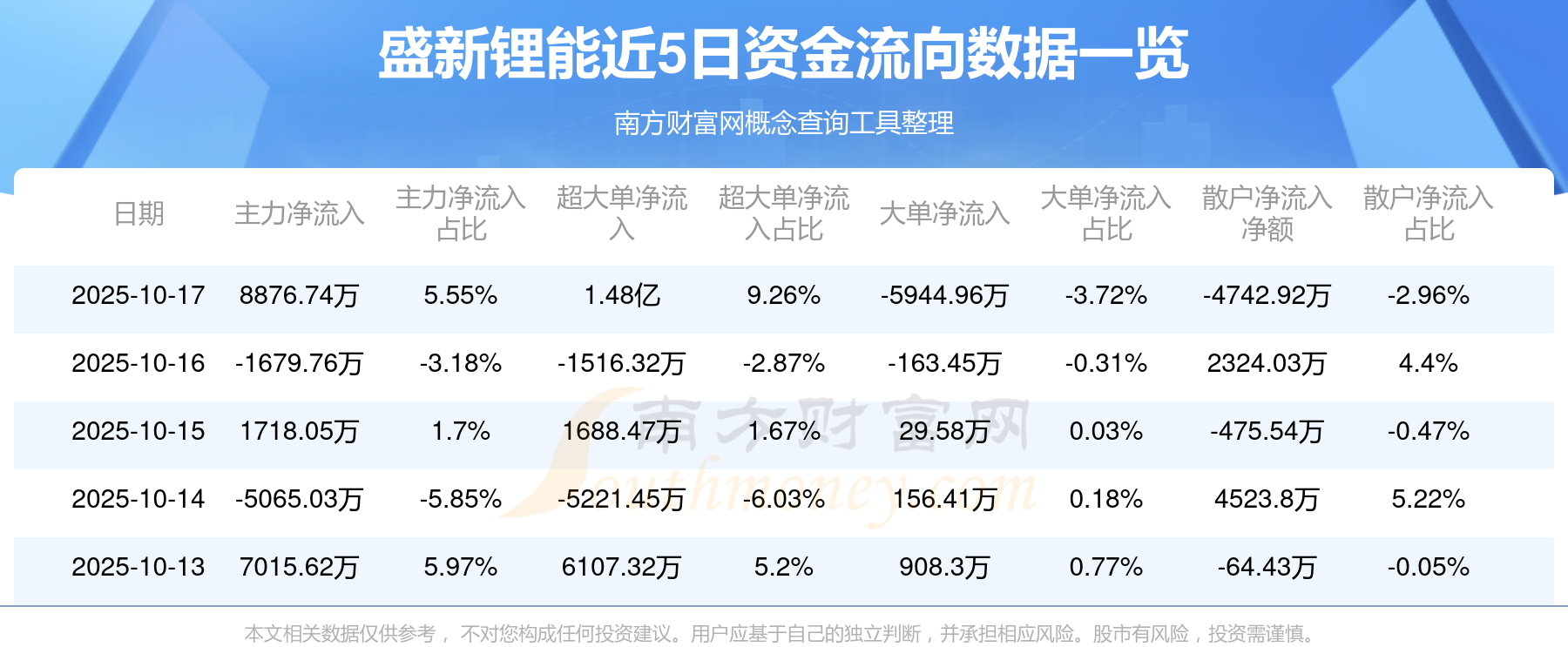 10月17日消息,盛新锂能资金净流入8876.74万元,超大单净流入1.48亿元,换手率9.08%,成交金额16亿元。