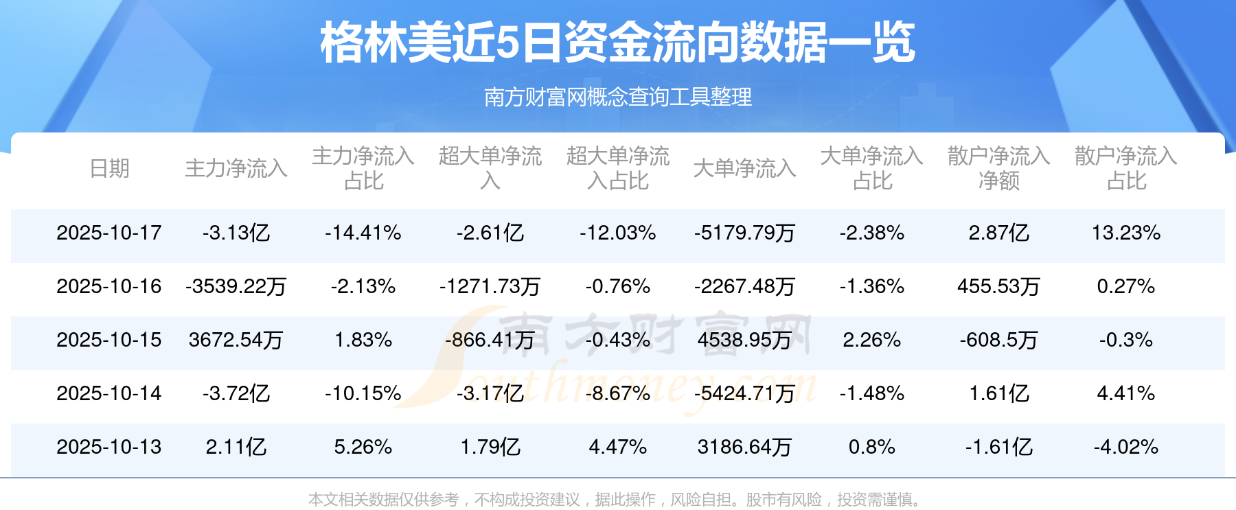 10月17日消息,格林美主力资金净流出3.13亿元,超大单资金净流出2.61亿元,散户资金净流入2.87亿元。