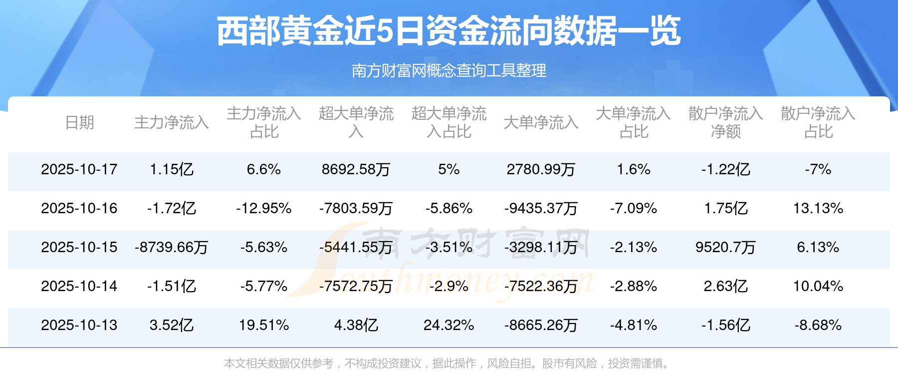 10月17日消息,西部黄金资金净流入1.15亿元,超大单净流入8692.58万元,换手率5.82%,成交金额17.39亿元。