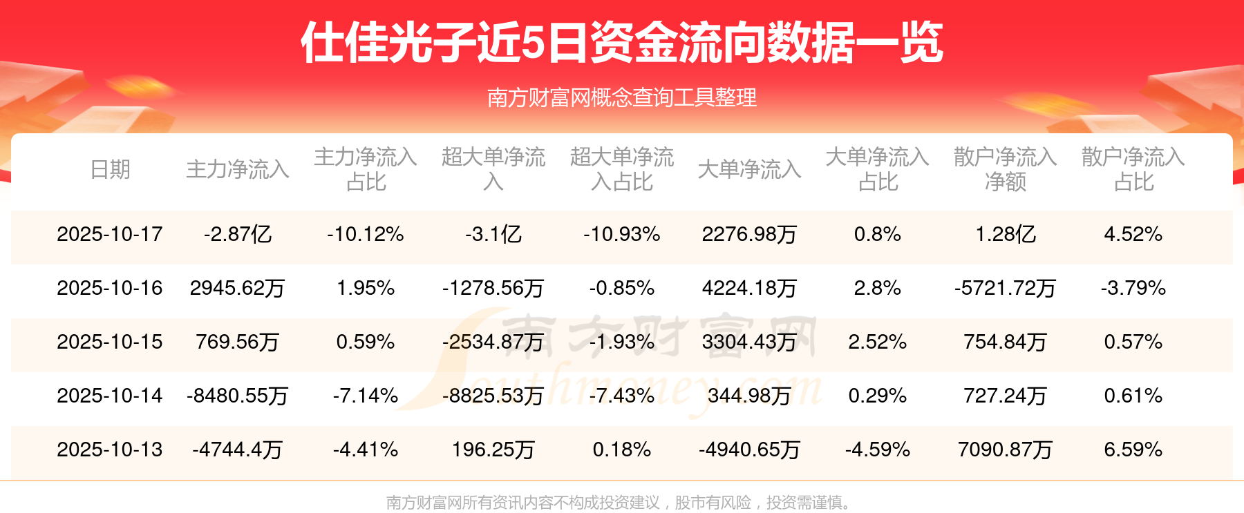 10月17日消息,仕佳光子10月17日主力资金净流出2.87亿元,超大单资金净流出3.1亿元,大单资金净流入2276.98万元,散户资金净流入1.28亿元。