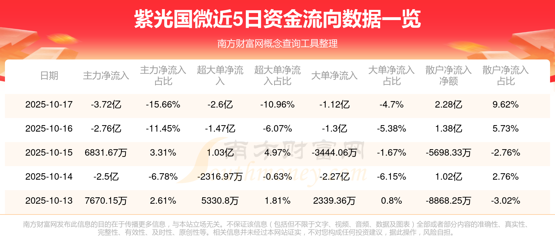 10月17日消息,紫光国微主力资金净流出3.72亿元,超大单资金净流出2.6亿元,散户资金净流入2.28亿元。