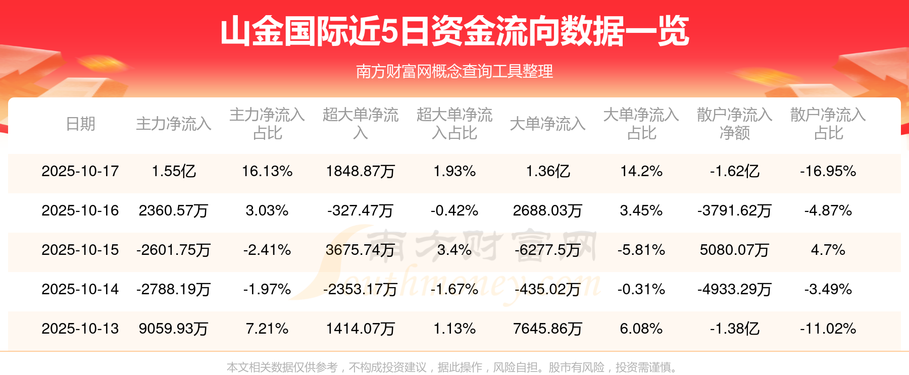 10月17日消息,山金国际10月17日主力资金净流入1.55亿元,超大单资金净流入1848.87万元,大单资金净流入1.36亿元,散户资金净流出1.62亿元。
