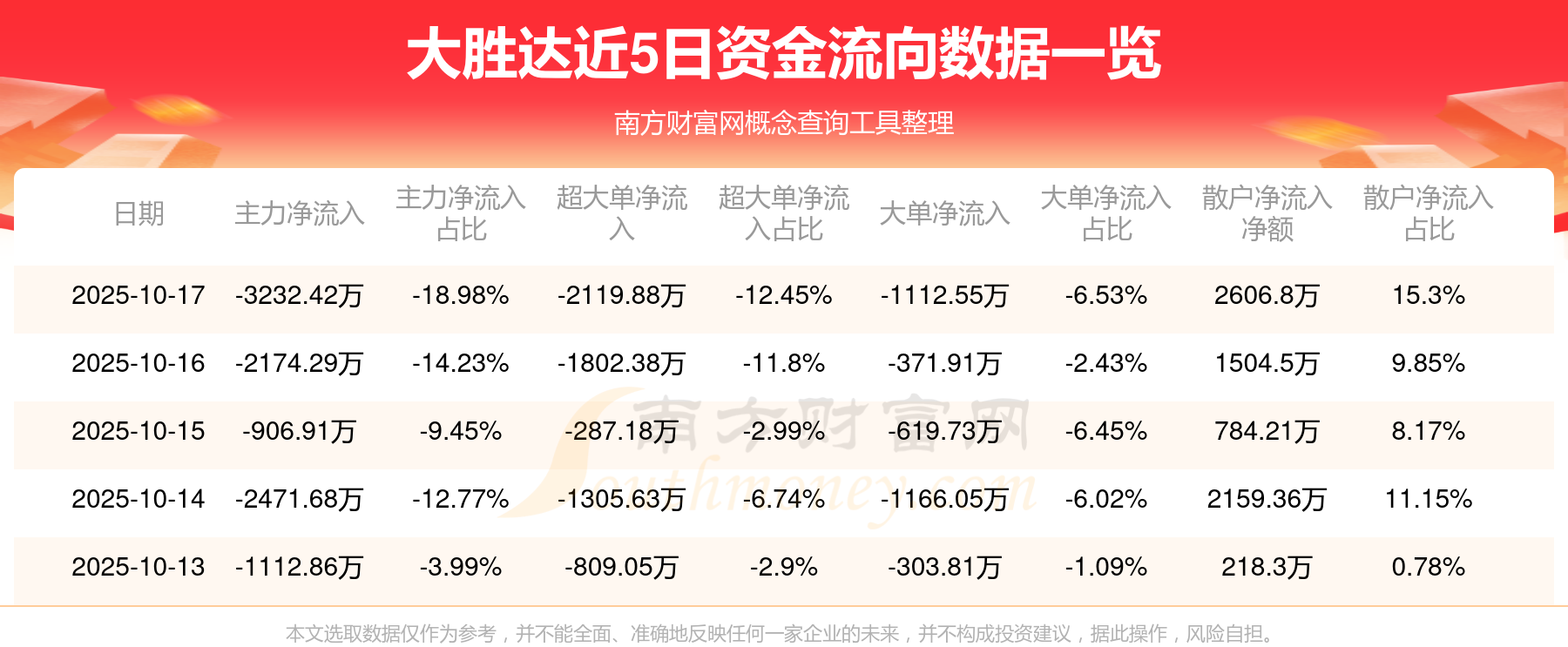 10月17日消息,大胜达资金净流出3232.42万元,超大单净流出2119.88万元,换手率3.58%,成交金额1.7亿元。