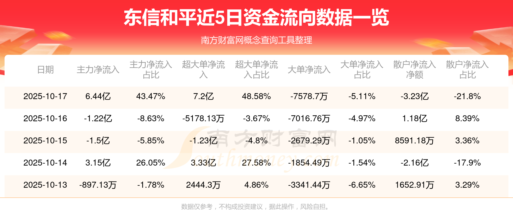 10月17日消息,东信和平资金净流入6.44亿元,超大单净流入7.2亿元,换手率9.93%,成交金额14.82亿元。