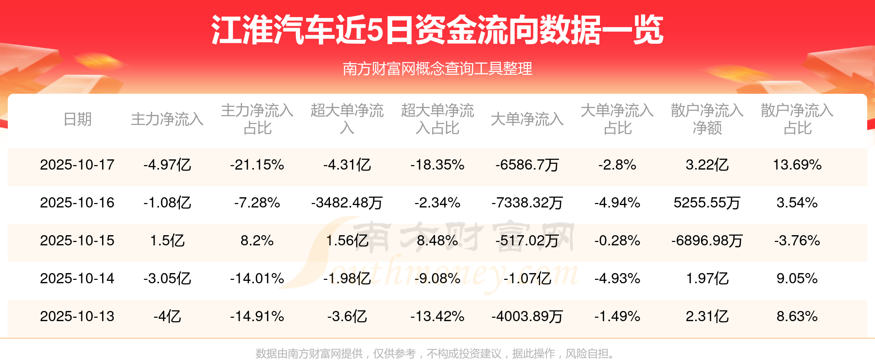 10月17日消息,江淮汽车10月17日主力净流出4.97亿元,超大单净流出4.31亿元,大单净流出6586.7万元,散户净流入3.22亿元。