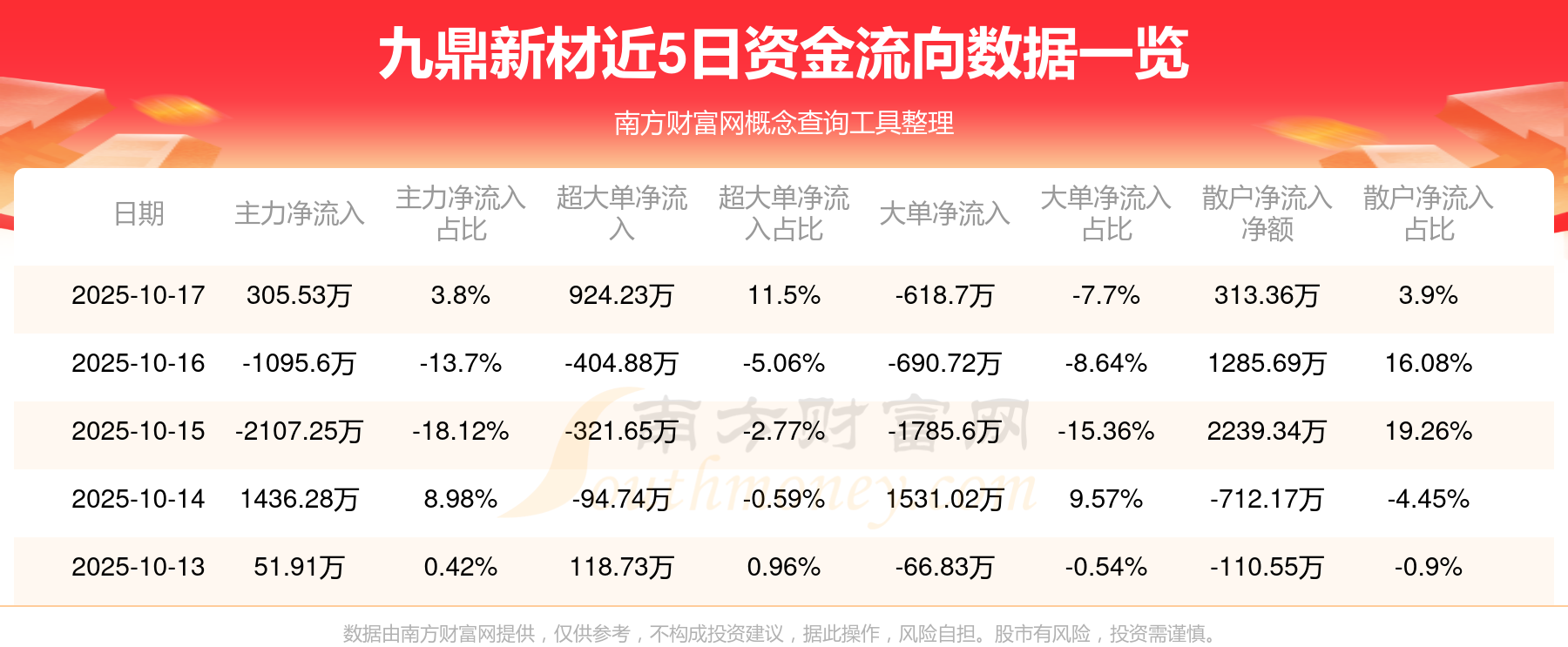10月17日消息,九鼎新材主力资金净流入305.53万元,超大单资金净流入924.23万元,散户资金净流入313.36万元。