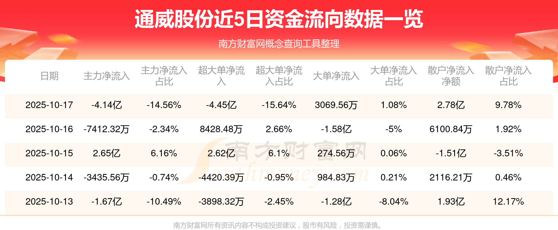 10月17日该股主力资金净流出4.14亿元,超大单资金净流出4.45亿元,大单资金净流入3069.56万元,中单资金净流入1.36亿元,散户资金净流入2.78亿元。