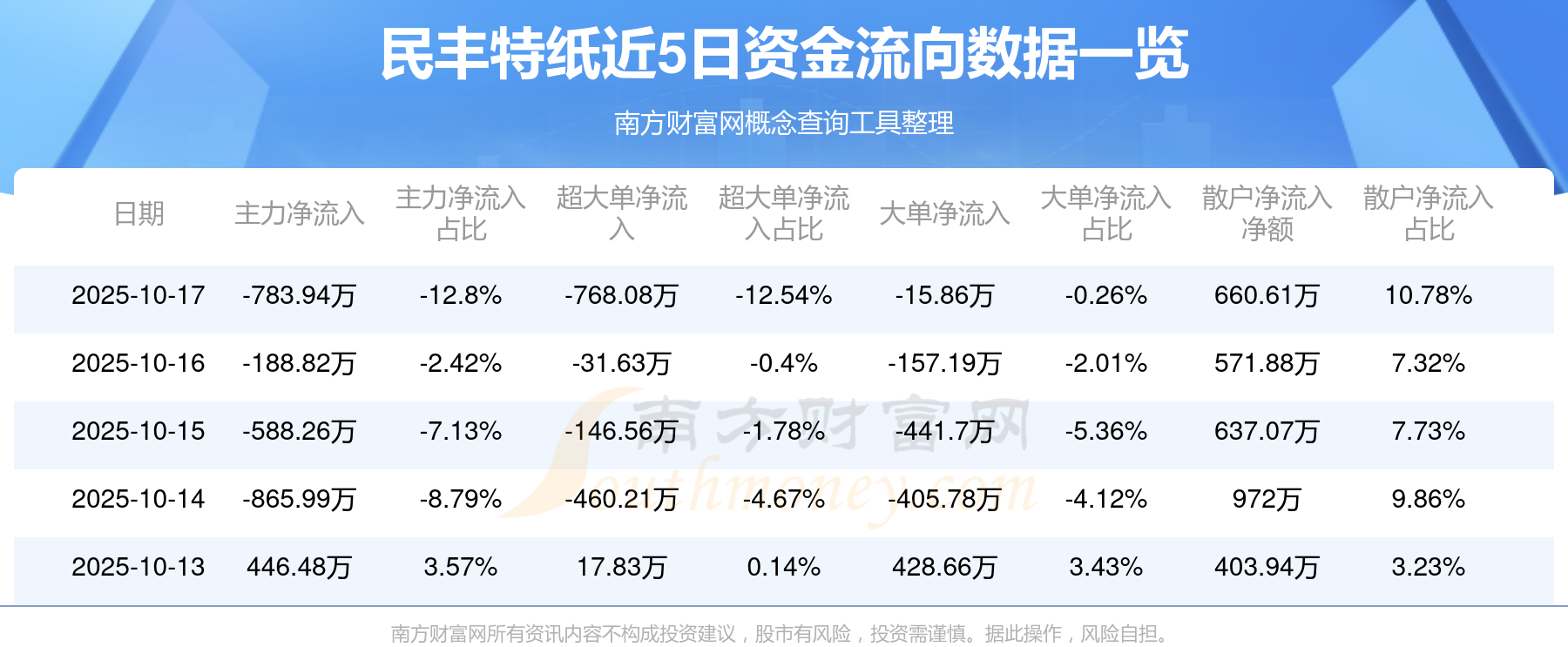 10月17日消息,民丰特纸10月17日主力净流出783.94万元,超大单净流出768.08万元,大单净流出15.86万元,散户净流入660.61万元。