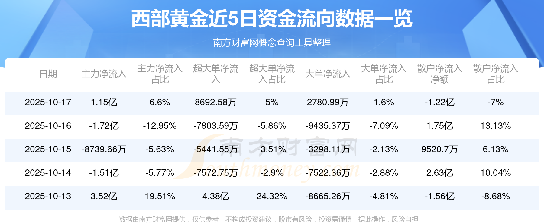 10月17日消息,西部黄金10月17日主力净流入1.15亿元,超大单净流入8692.58万元,大单净流入2780.99万元,散户净流出1.22亿元。