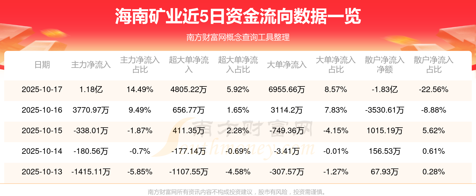 截至10月17日15时,海南矿业报9.150元,涨2.68%,换手率4.44%,成交量8793.39万手,市值为182.84亿元。