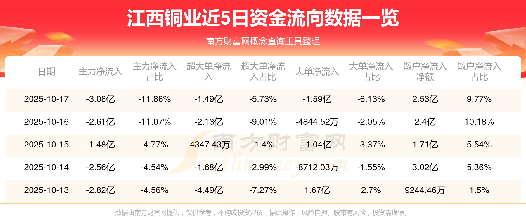 10月17日消息,江西铜业10月17日主力资金净流出3.08亿元,超大单资金净流出1.49亿元,大单资金净流出1.59亿元,散户资金净流入2.53亿元。