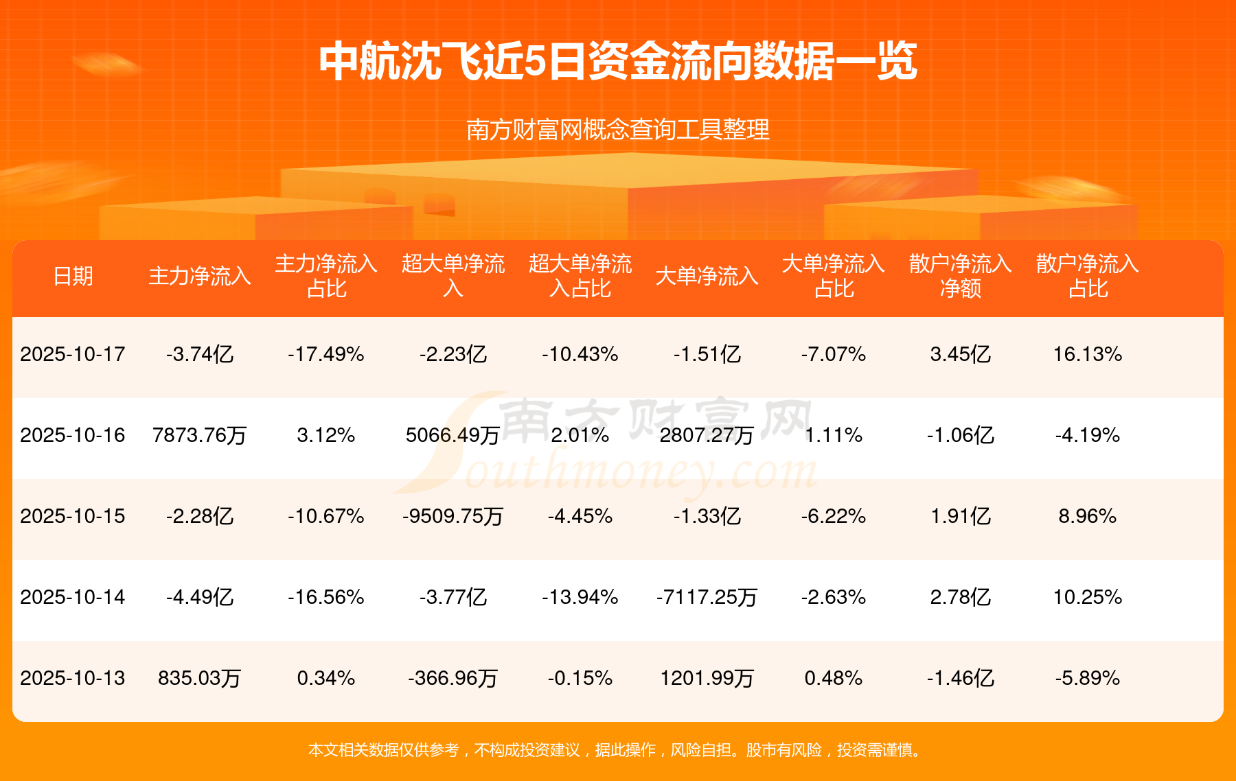 10月17日消息,中航沈飞主力资金净流出3.74亿元,超大单资金净流出2.23亿元,散户资金净流入3.45亿元。