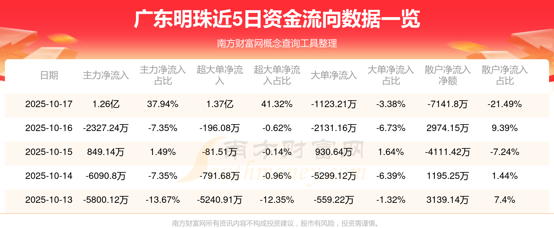 10月17日消息,广东明珠资金净流入1.26亿元,超大单净流入1.37亿元,换手率6.6%,成交金额3.32亿元。