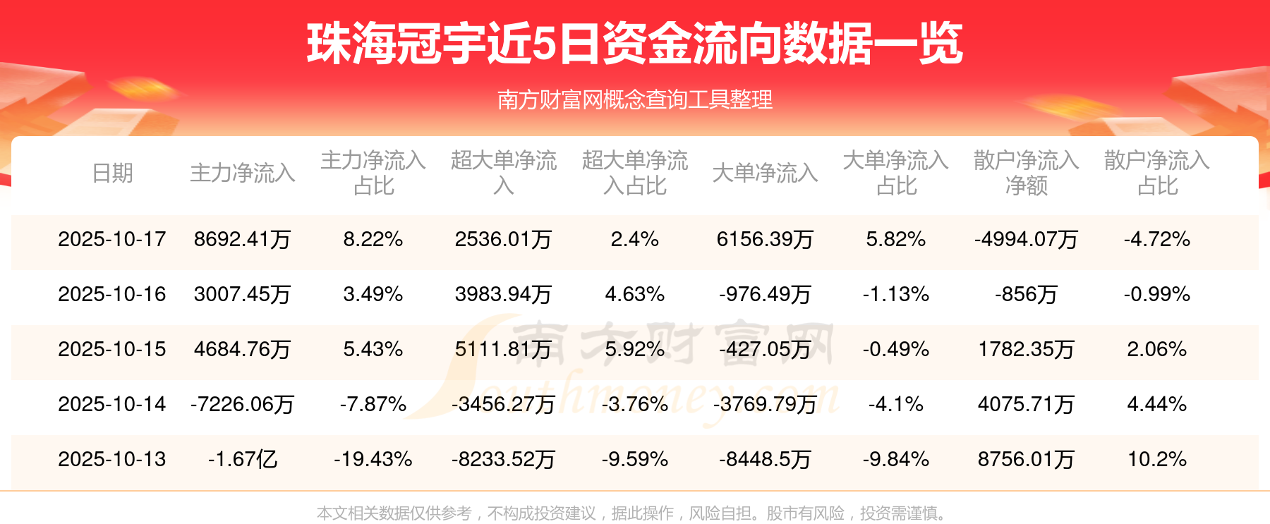 10月17日消息,珠海冠宇主力资金净流入8692.41万元,超大单资金净流入2536.01万元,散户资金净流出4994.07万元。