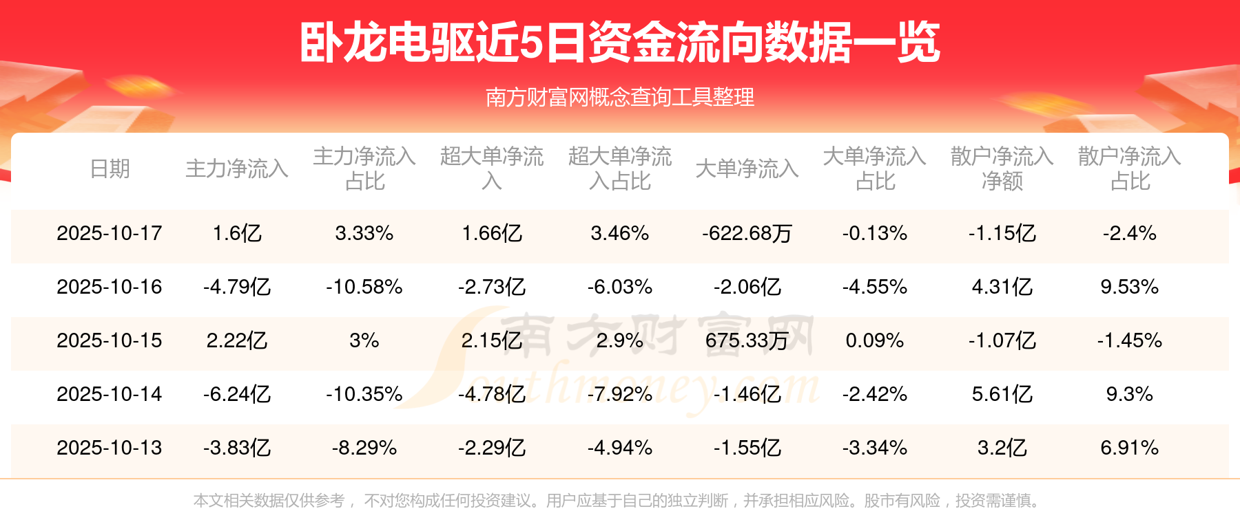 10月17日消息,卧龙电驱10月17日主力资金净流入1.6亿元,超大单资金净流入1.66亿元,大单资金净流出622.68万元,散户资金净流出1.15亿元。
