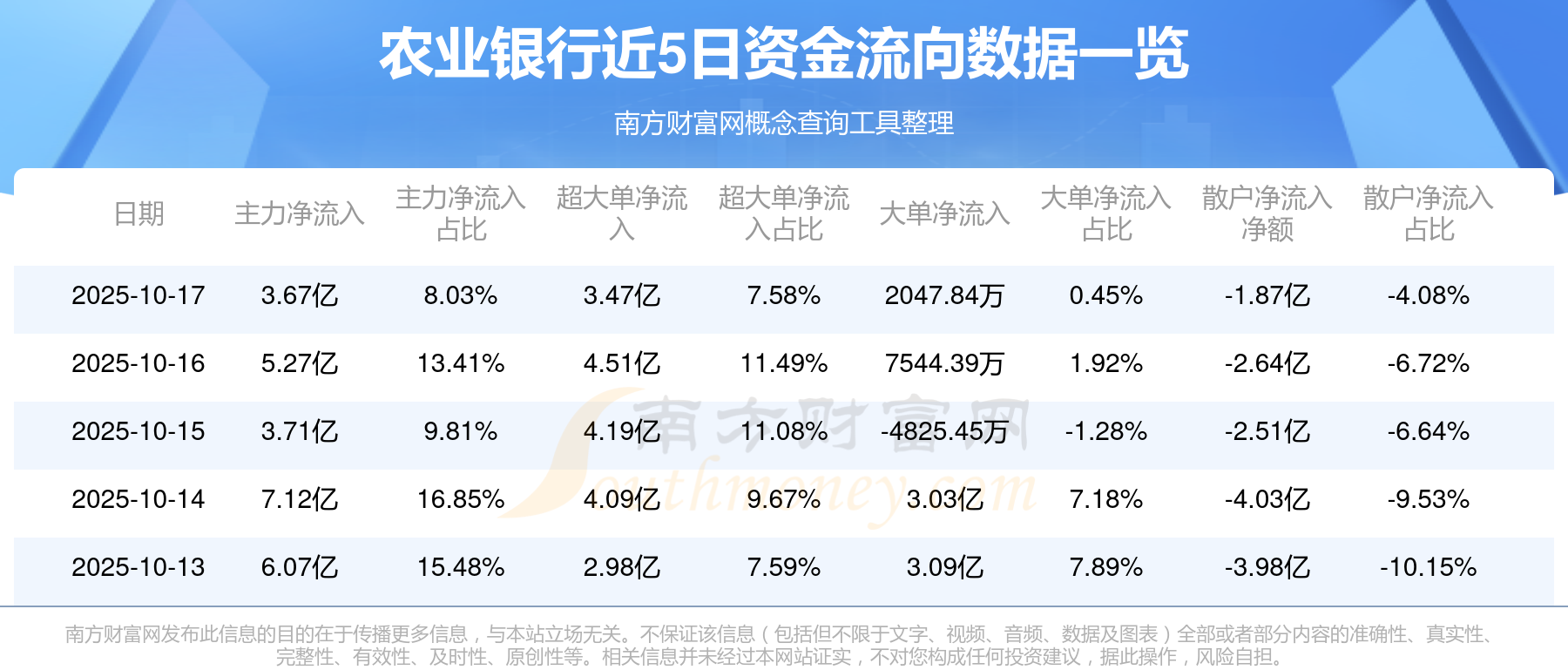 10月17日消息,农业银行主力净流入3.67亿元,超大单净流入3.47亿元,散户净流出1.87亿元。