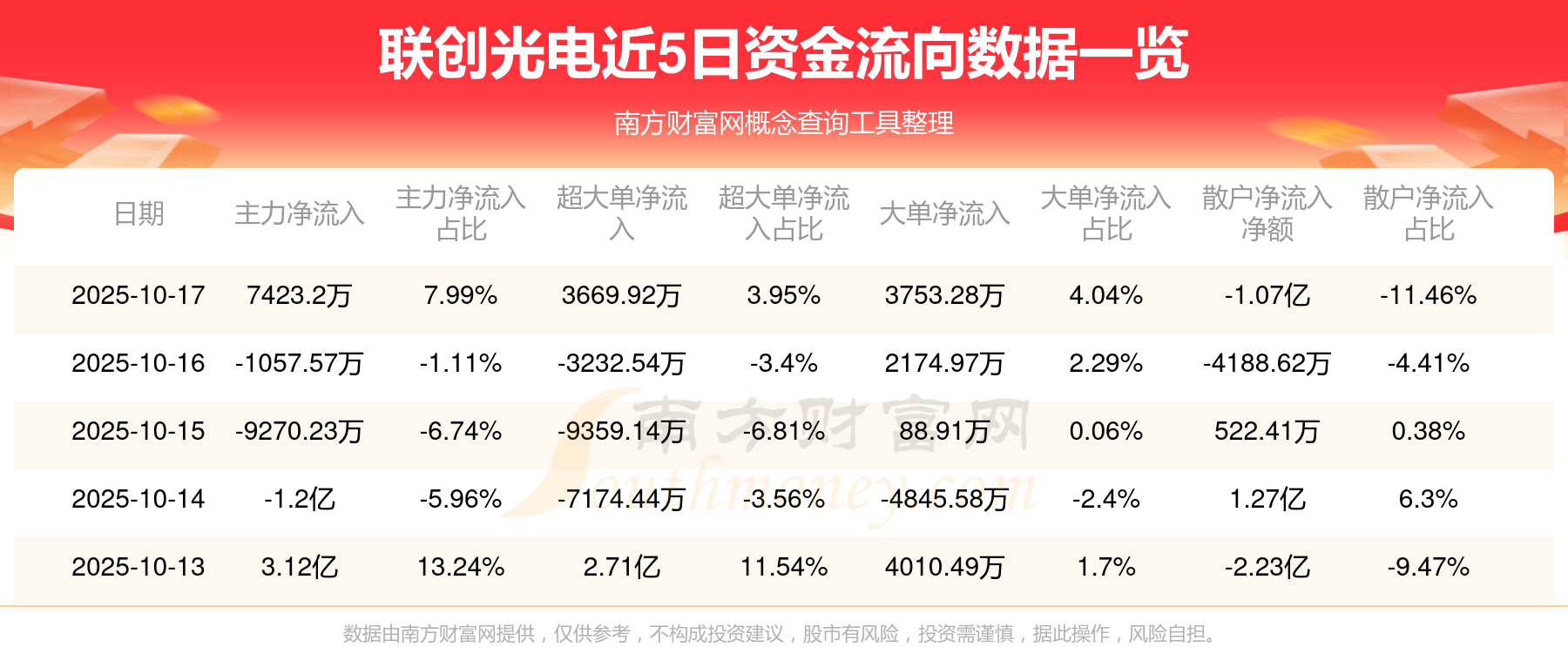 10月17日消息,联创光电资金净流入7423.2万元,超大单资金净流入3669.92万元,换手率3.32%,成交金额9.3亿元。