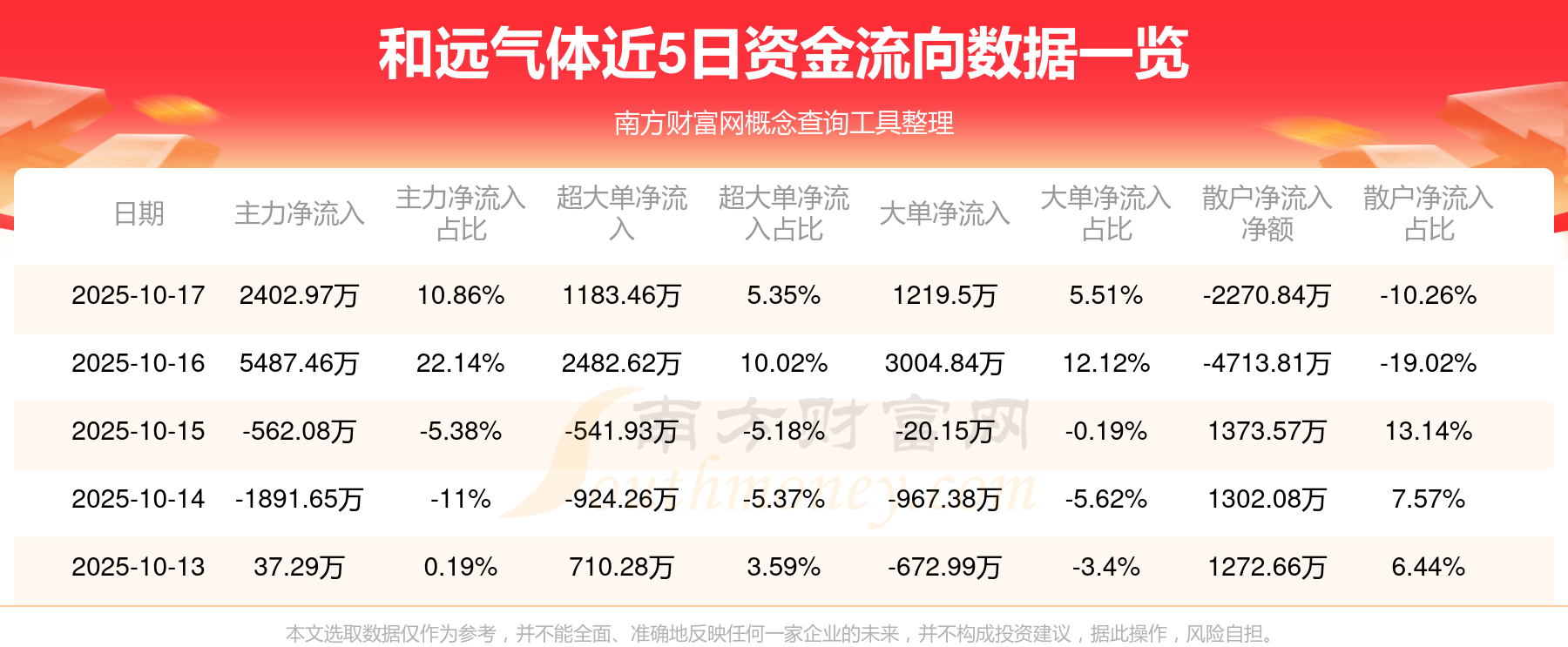 10月17日消息,和远气体主力资金净流入2402.97万元,超大单资金净流入1183.46万元,散户资金净流出2270.84万元。