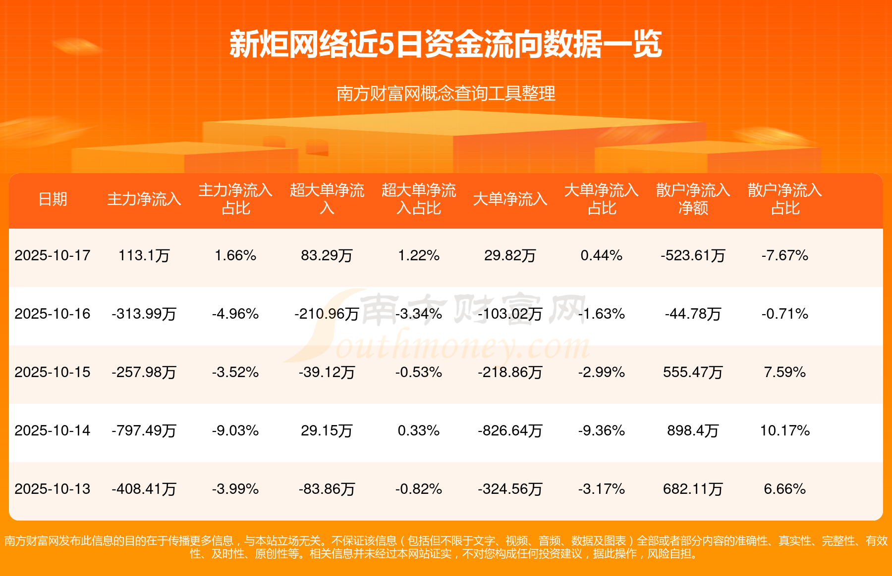 10月17日消息,新炬网络10月17日主力资金净流入113.1万元,超大单资金净流入83.29万元,大单资金净流入29.82万元,散户资金净流出523.61万元。