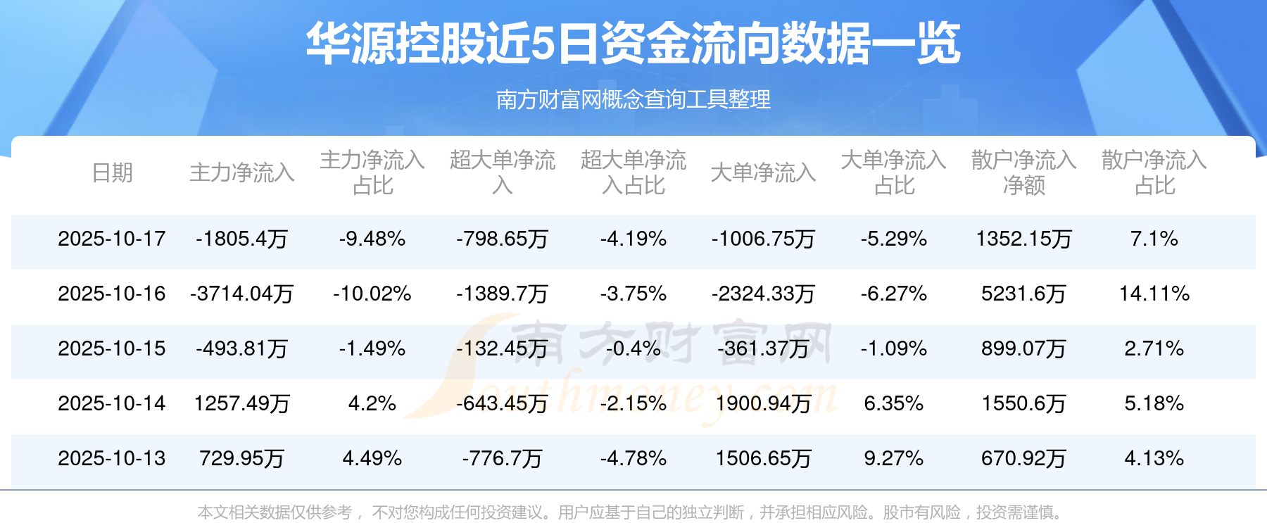 截至10月15日14时,华源控股报9.430元,涨5.65%,换手率8.04%,成交量2015.72万手,市值为31.61亿元。