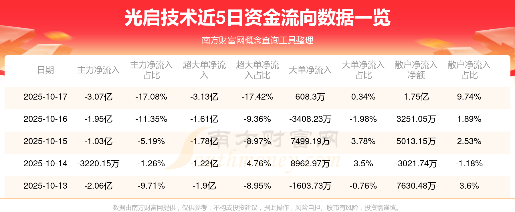 10月17日消息,光启技术主力净流出3.07亿元,超大单净流出3.13亿元,散户净流入1.75亿元。