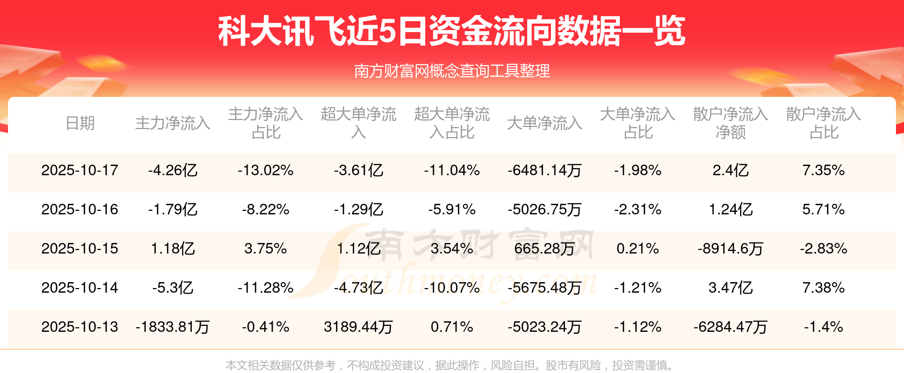 10月17日消息,科大讯飞主力资金净流出4.26亿元,超大单资金净流出3.61亿元,散户资金净流入2.4亿元。